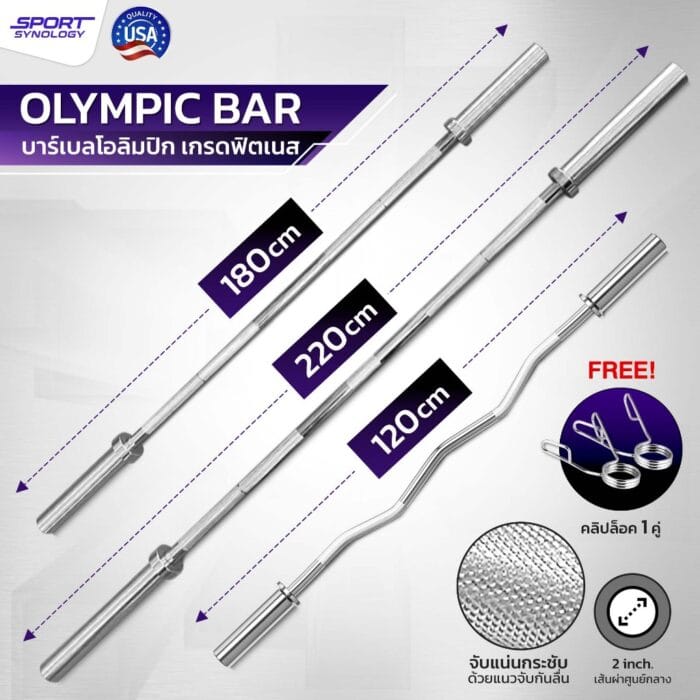 OLYMPIC BAR บาร์เบลโอลิมปิกขนาด 1.2 / 1.8 / 2.2 เมตร ที่ใส่แผ่นน้ำหนักขนาด 2 นิ้ว